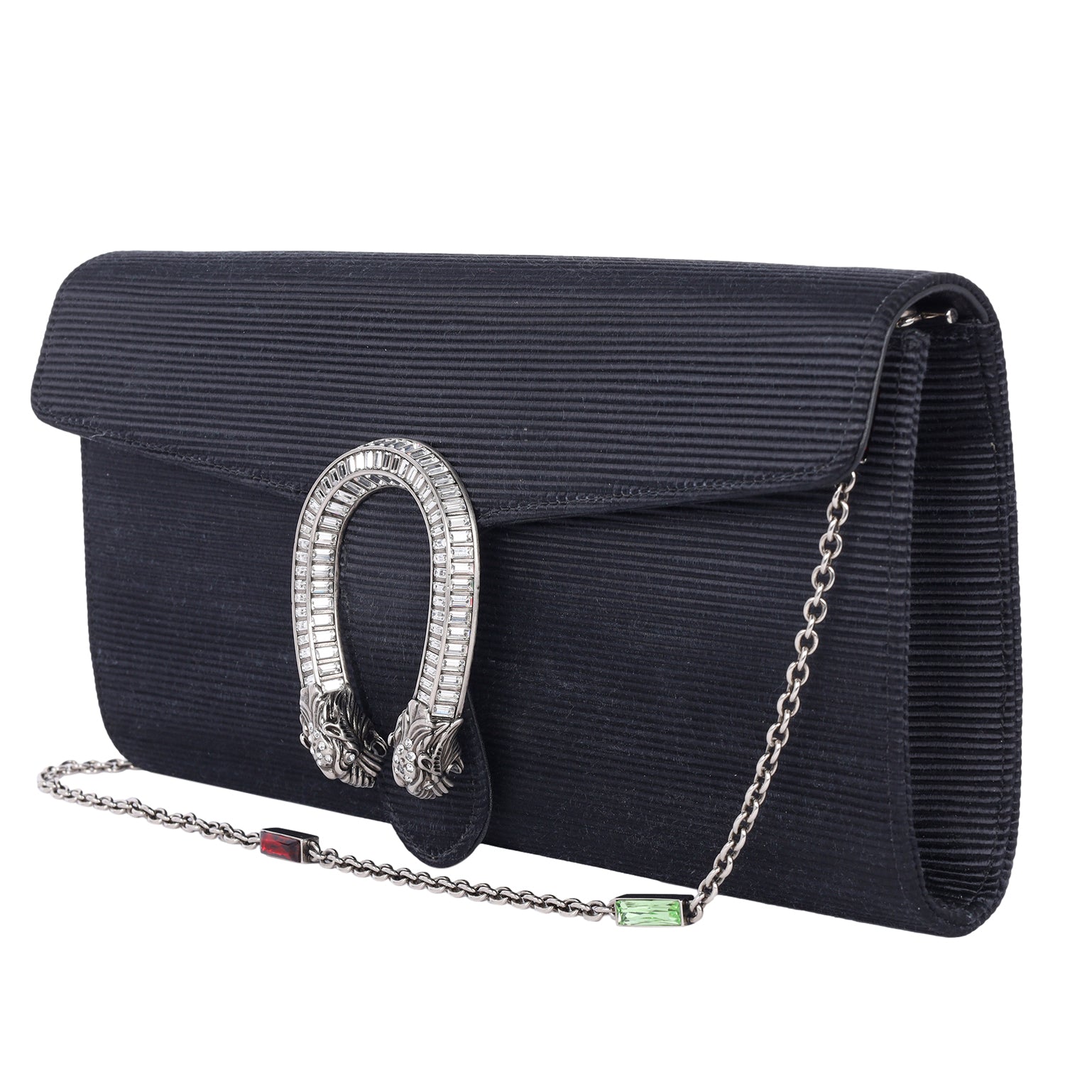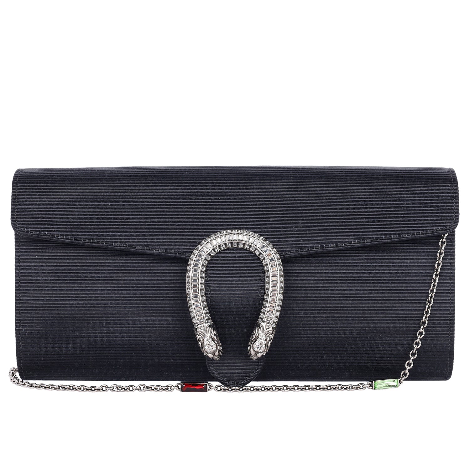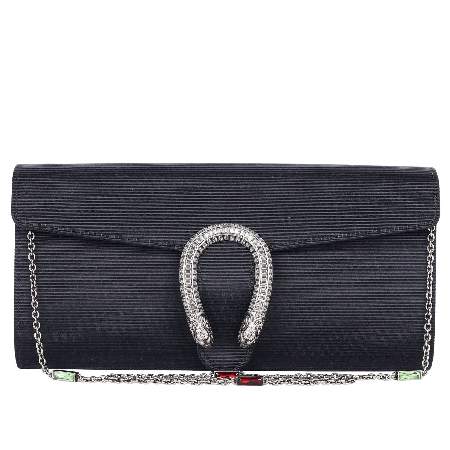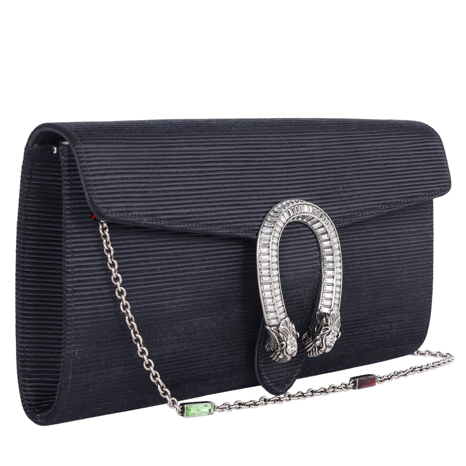 The Gucci Dionysus Clutch Shoulder Bag is a masterpiece of luxury and elegance, combining intricate detailing with an unmistakable design. Crafted with a ribbed satin body, this statement piece features a sleek black front flap adorned with the signature aged silver Dionysus horseshoe, encrusted with dazzling crystals. The silver chain shoulder strap is further elevated with striking green and red stone accents, adding a bold and sophisticated touch.