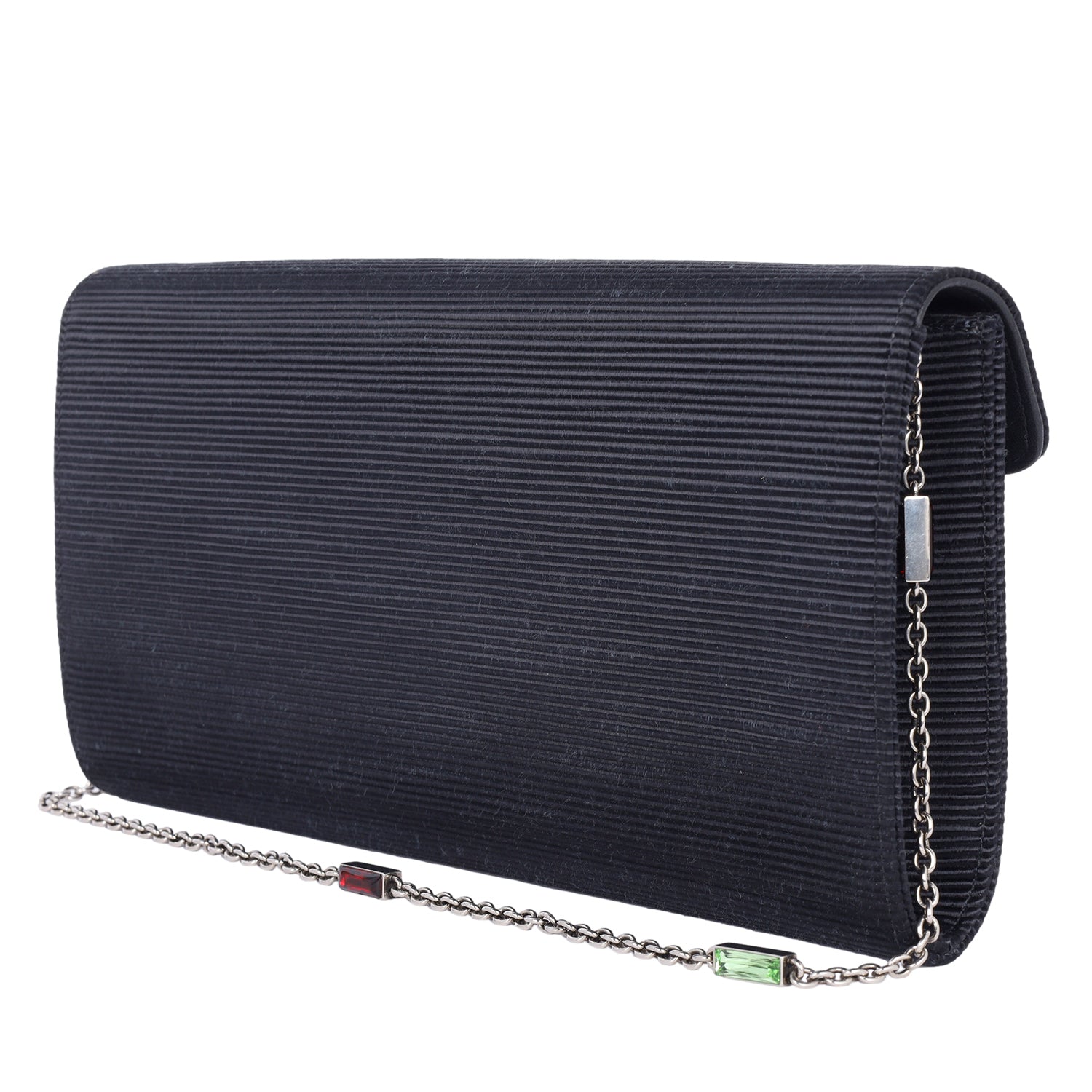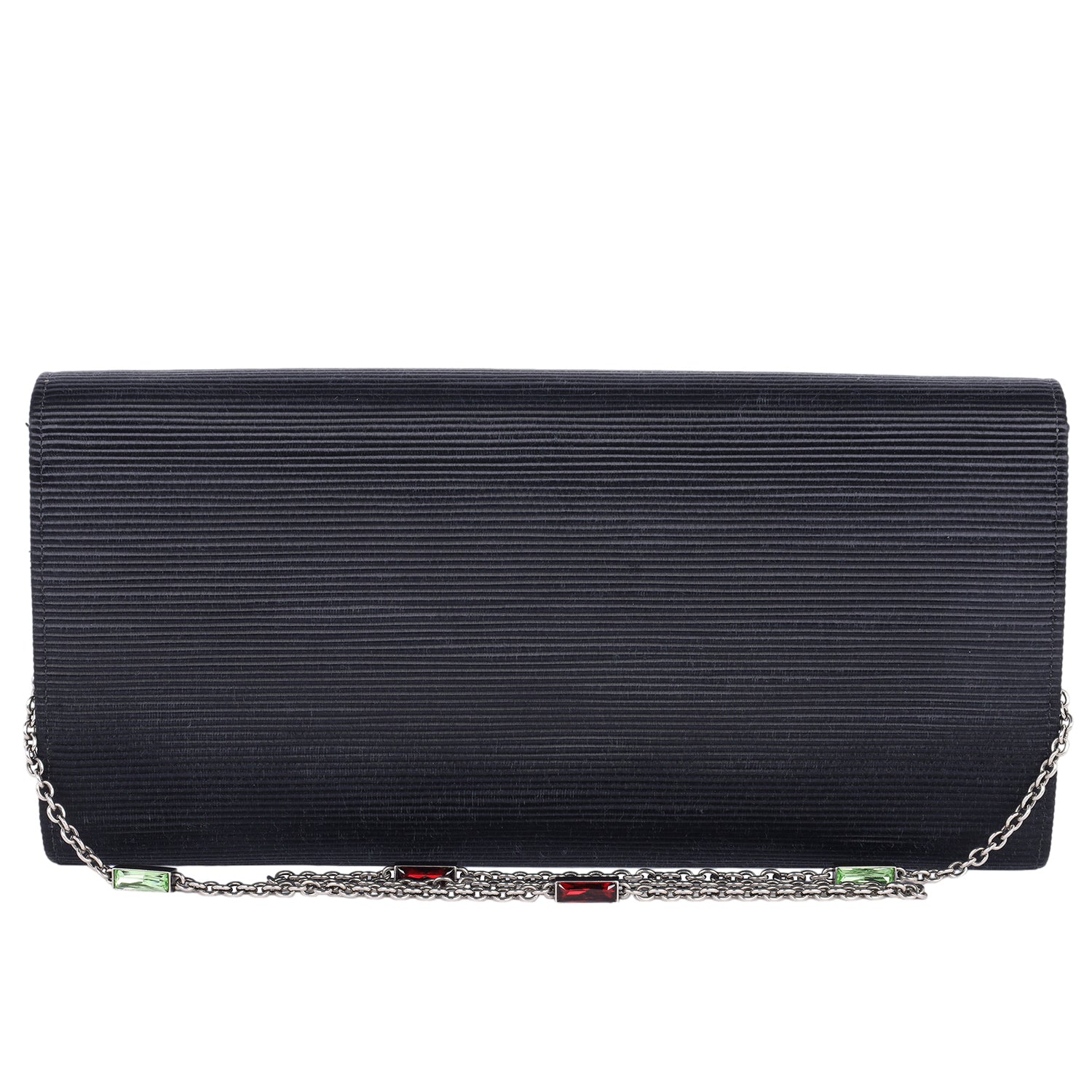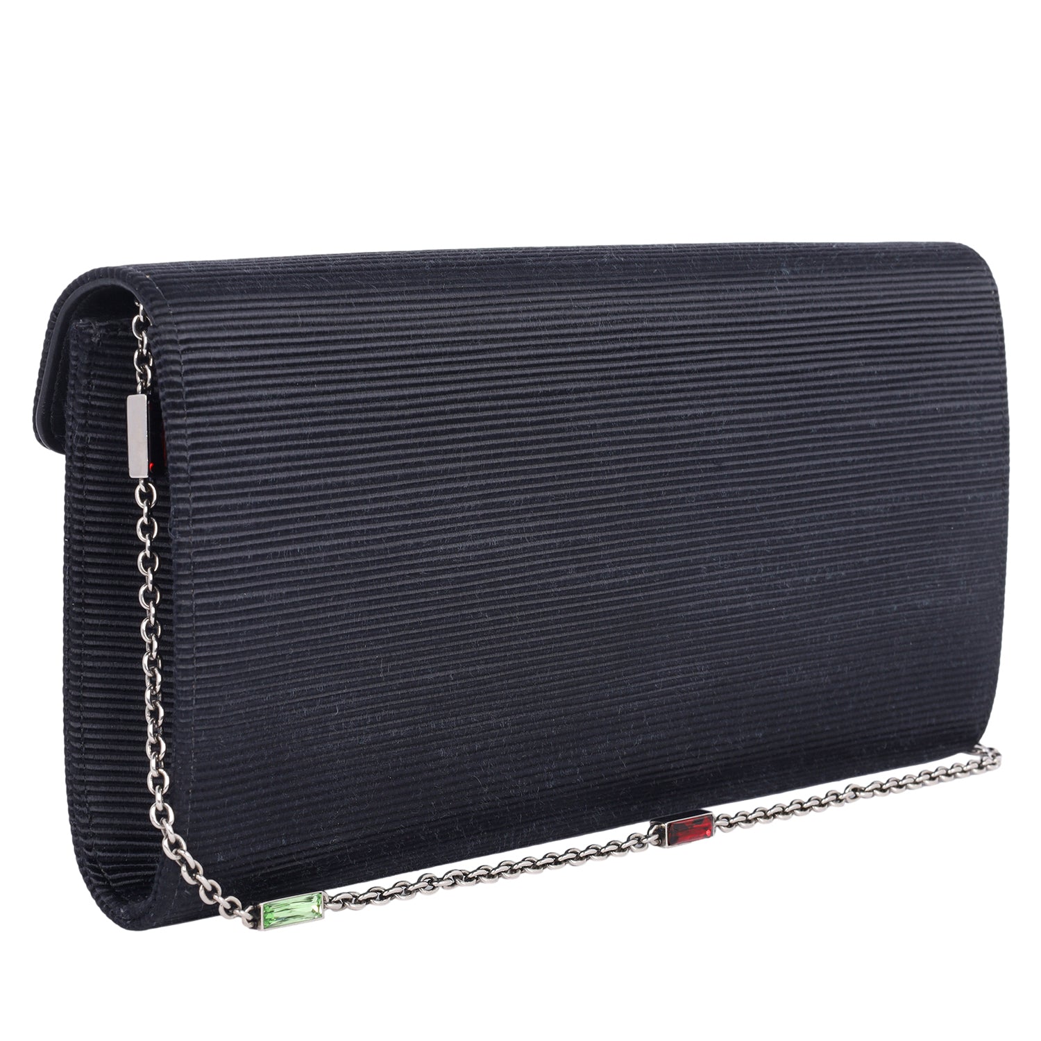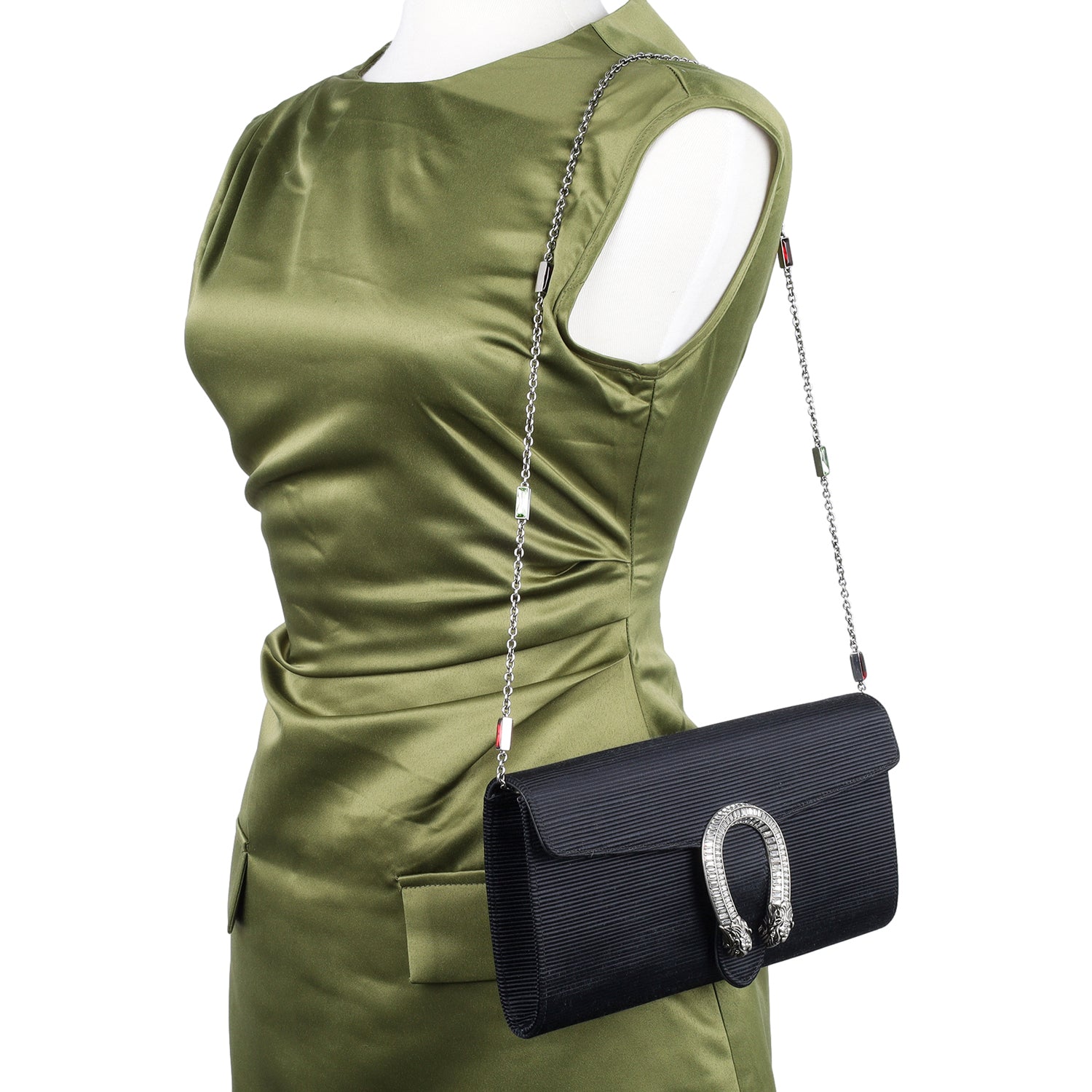The Gucci Dionysus Clutch Shoulder Bag is a masterpiece of luxury and elegance, combining intricate detailing with an unmistakable design. Crafted with a ribbed satin body, this statement piece features a sleek black front flap adorned with the signature aged silver Dionysus horseshoe, encrusted with dazzling crystals. The silver chain shoulder strap is further elevated with striking green and red stone accents, adding a bold and sophisticated touch.