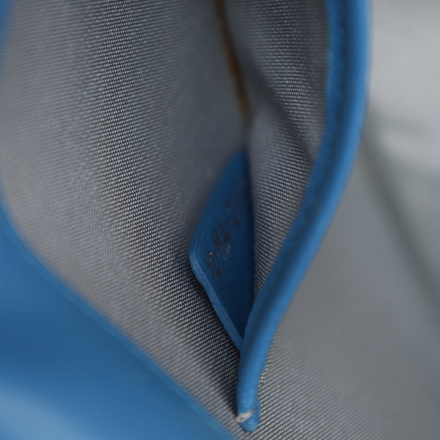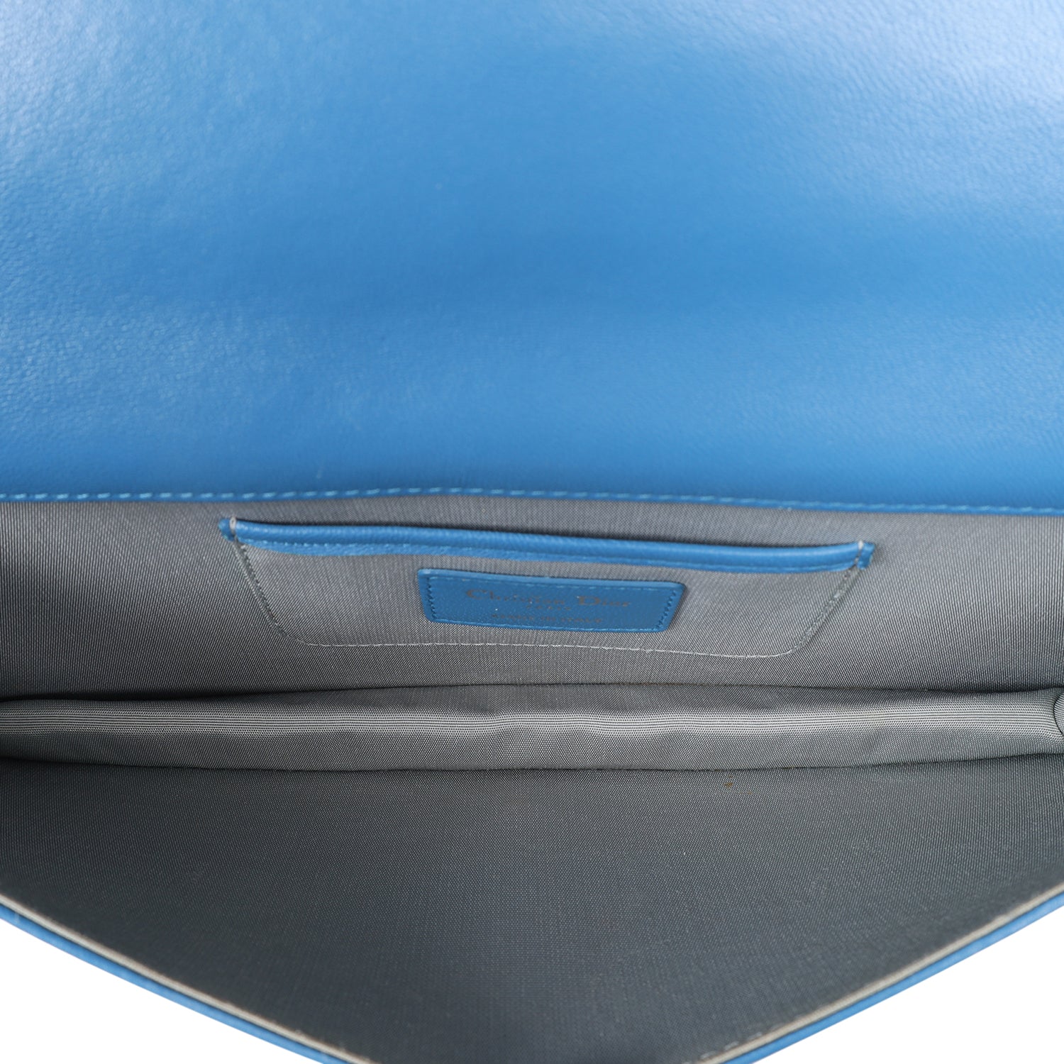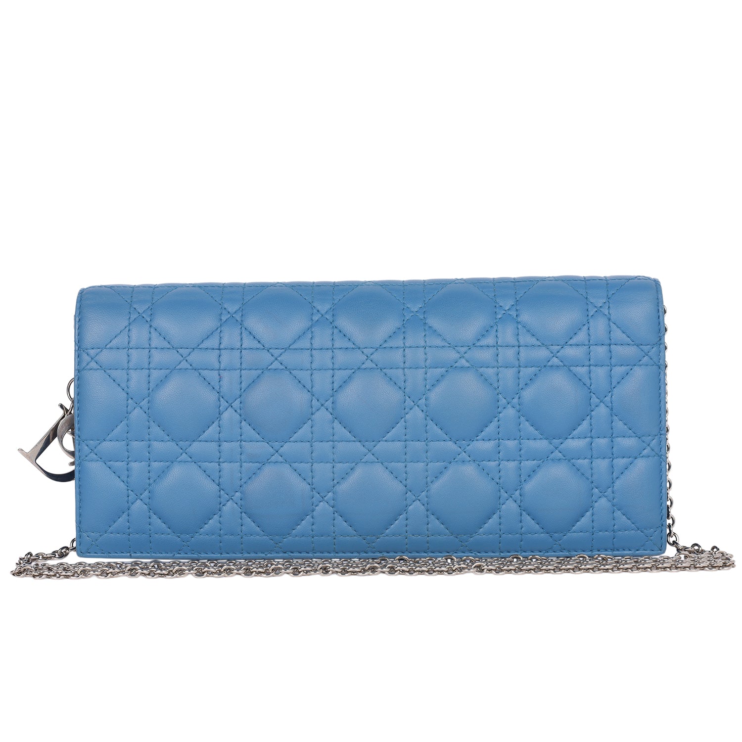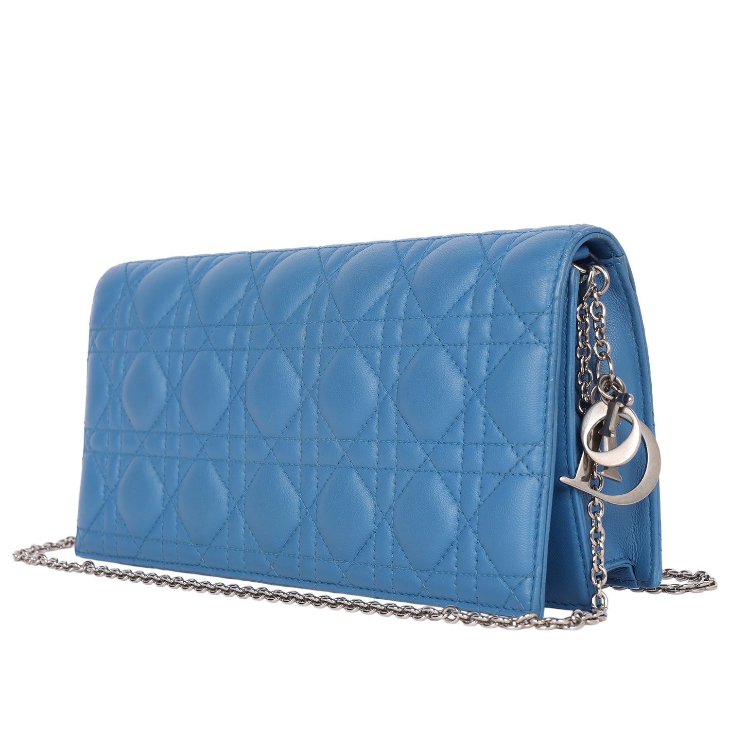 Features blue lambskin with Cannage topstitching and detachable D.I.O.R. charms, front flap snap closure, long removable chain link silver chain, large interior with slip pocket. This unique bag can be worn with or without its chain strap and used as a clutch.