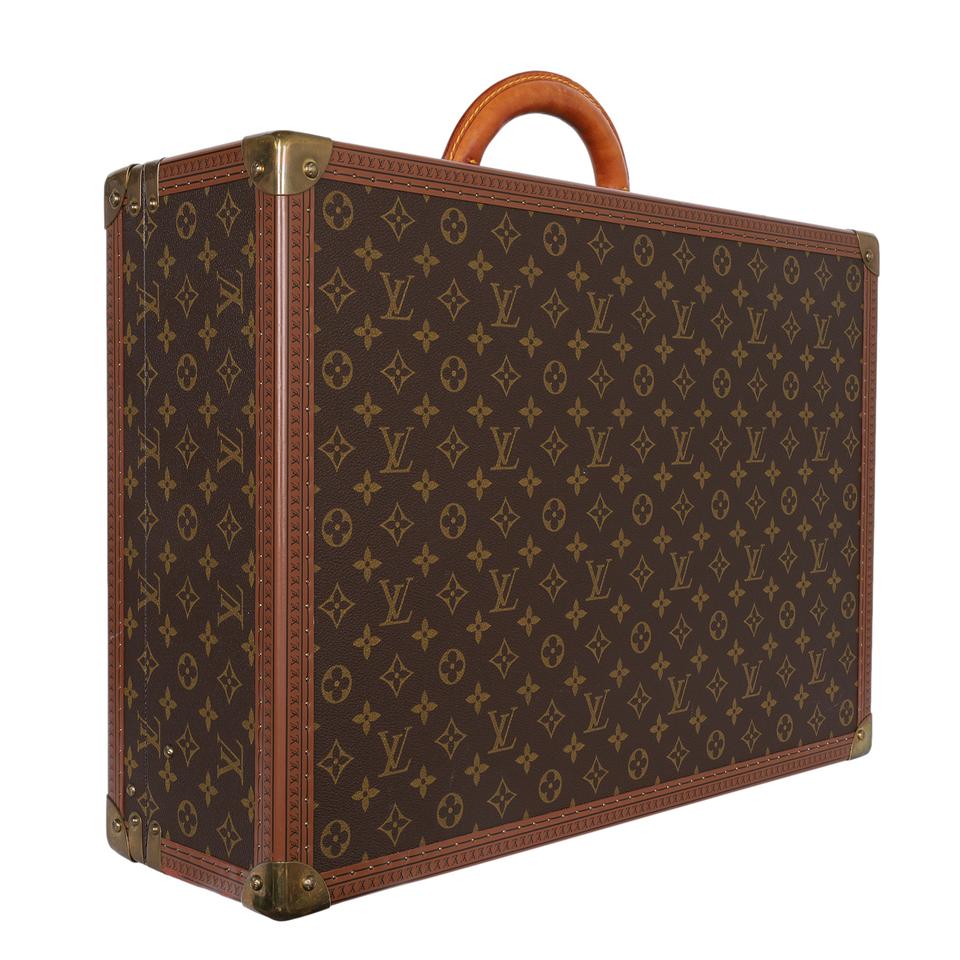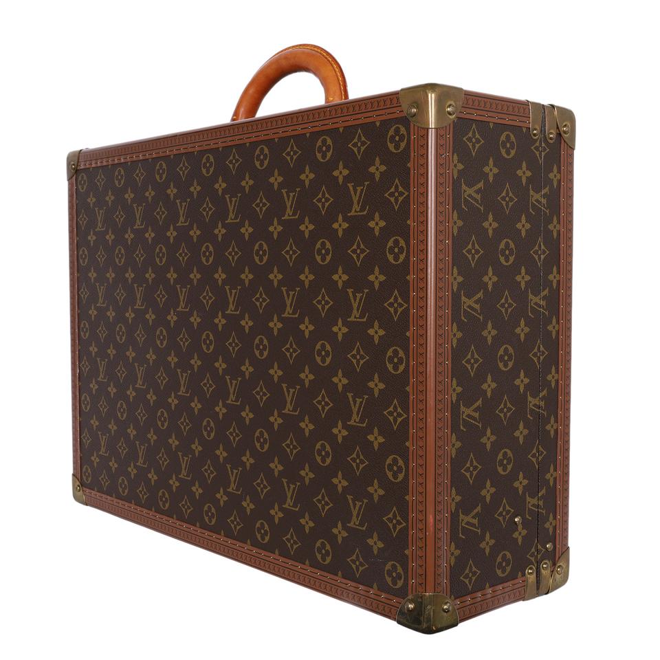Authentic, pre-loved Louis Vuitton Bisten 50 monogram hard case trunk. Would make quite the statement piece in a home, office, business window, etc. Louis Vuitton Bisten trunk suitcase is featured in their signature monogram coated canvas with vachetta leather accents and a single top handle. The suitcase offers a Louis Vuitton "S" lock, reinforced with two trunk latches, golden brass rivet trim and corners, and is leather lined with two interior vertical straps. Designer size 50.