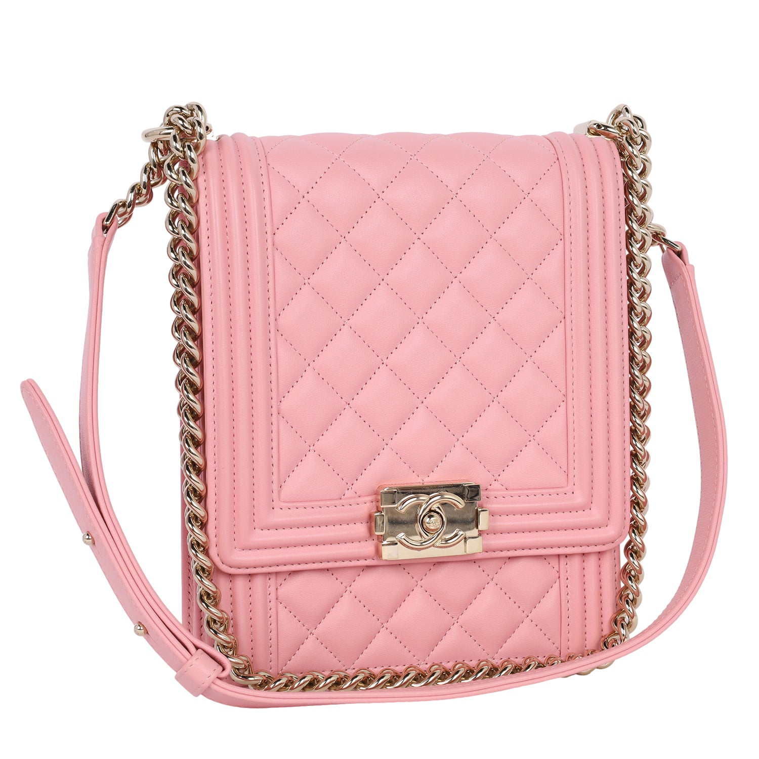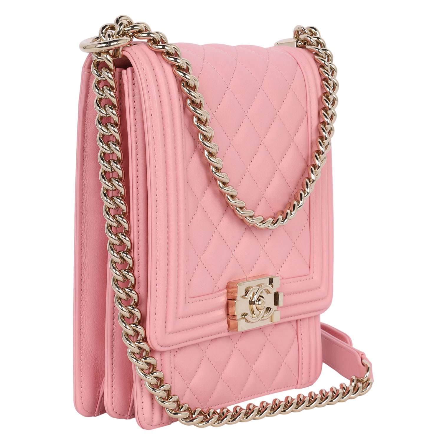 Elevate your collection with this rare and exquisite Chanel North South Boy Flap bag, a true investment piece in luxury fashion. Crafted from stunning pink chevron-quilted lambskin leather, this highly coveted designer handbag exudes timeless elegance and sophistication. The signature interlocking CC logo push-lock closure adds a bold statement, while the long gold link chain strap intertwined with pink leather offers versatile styling options.