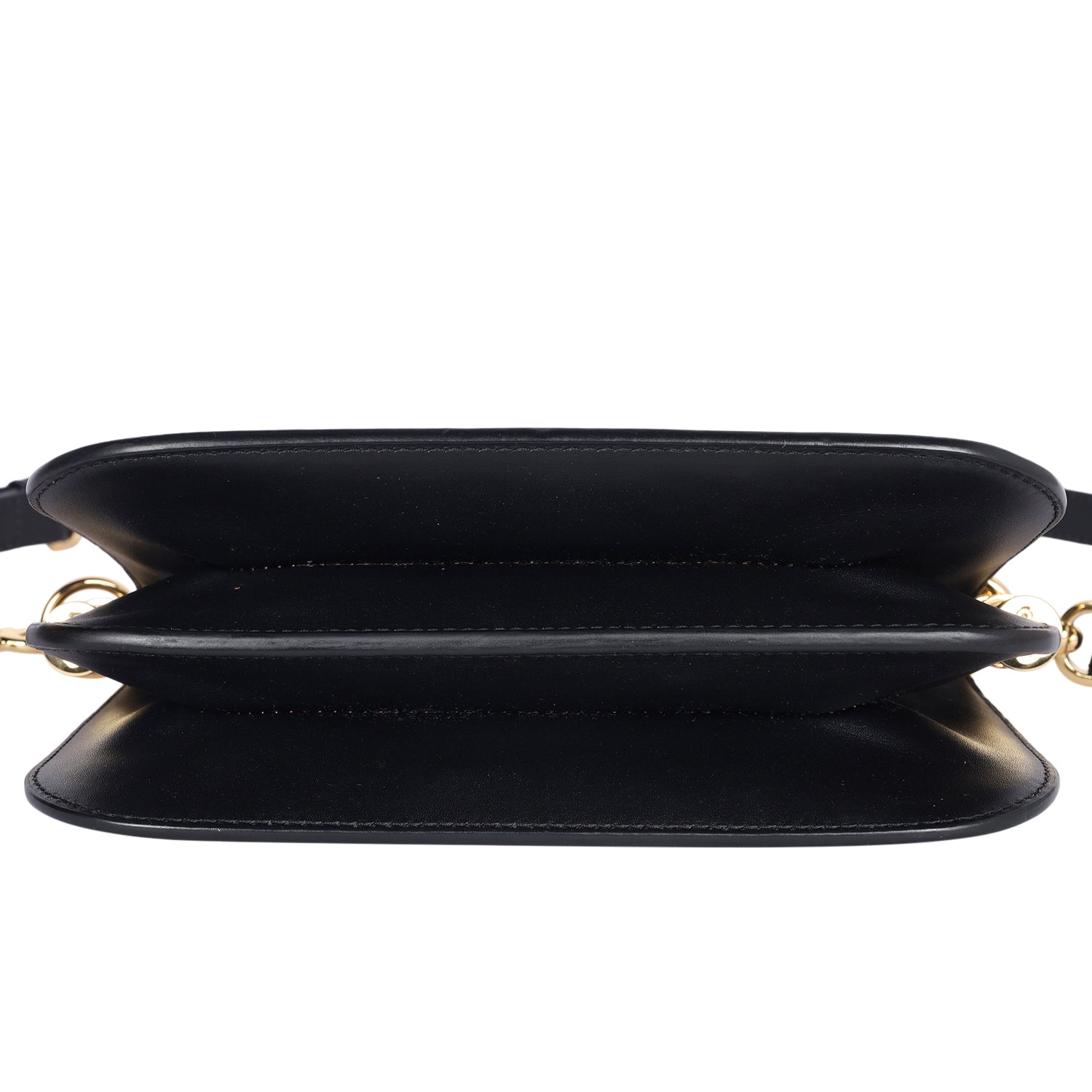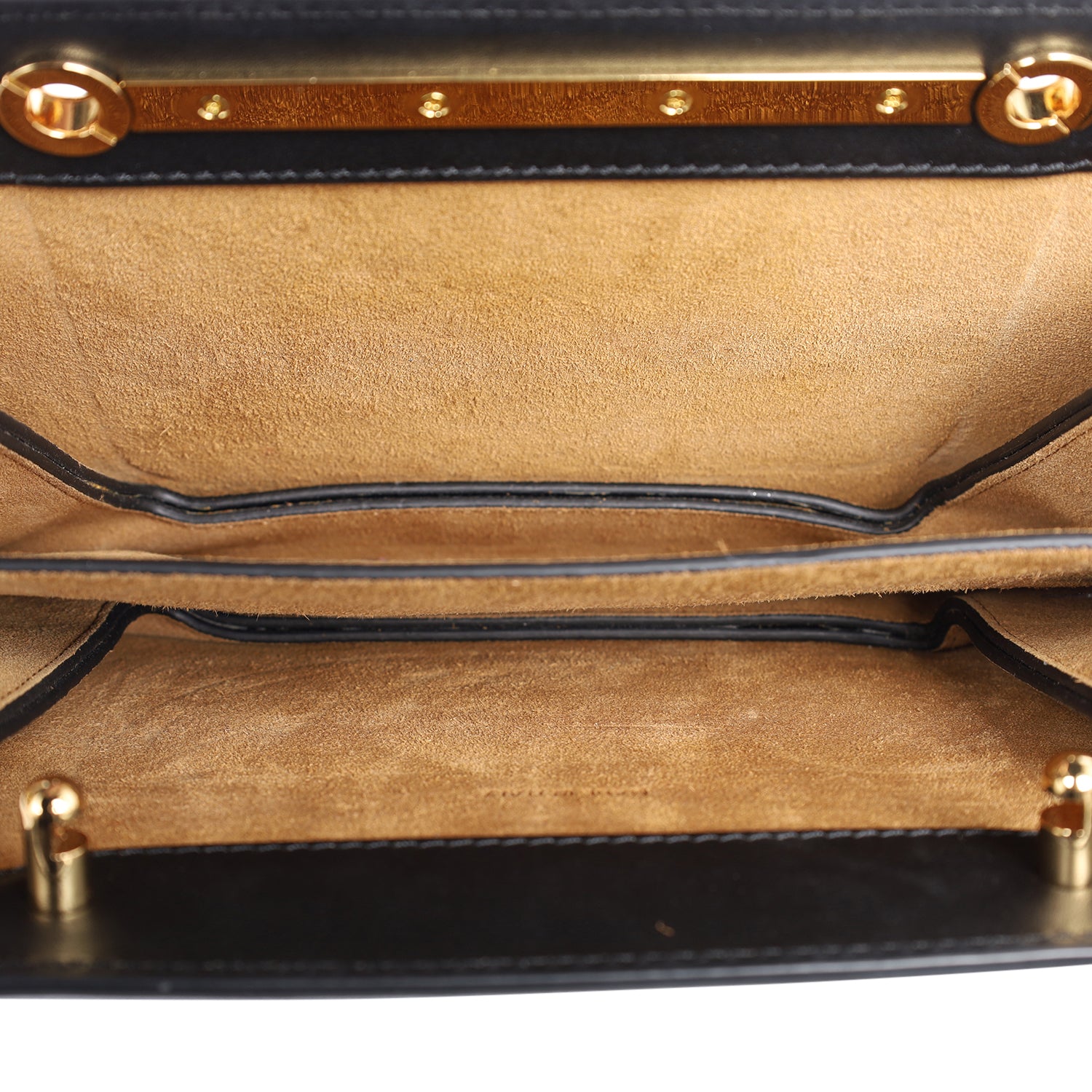 Features black calfskin leather, gold Fendi logo push lock closure, adjustable leather strap with gold hardware, partitioned brown suede interior with slip pocket.