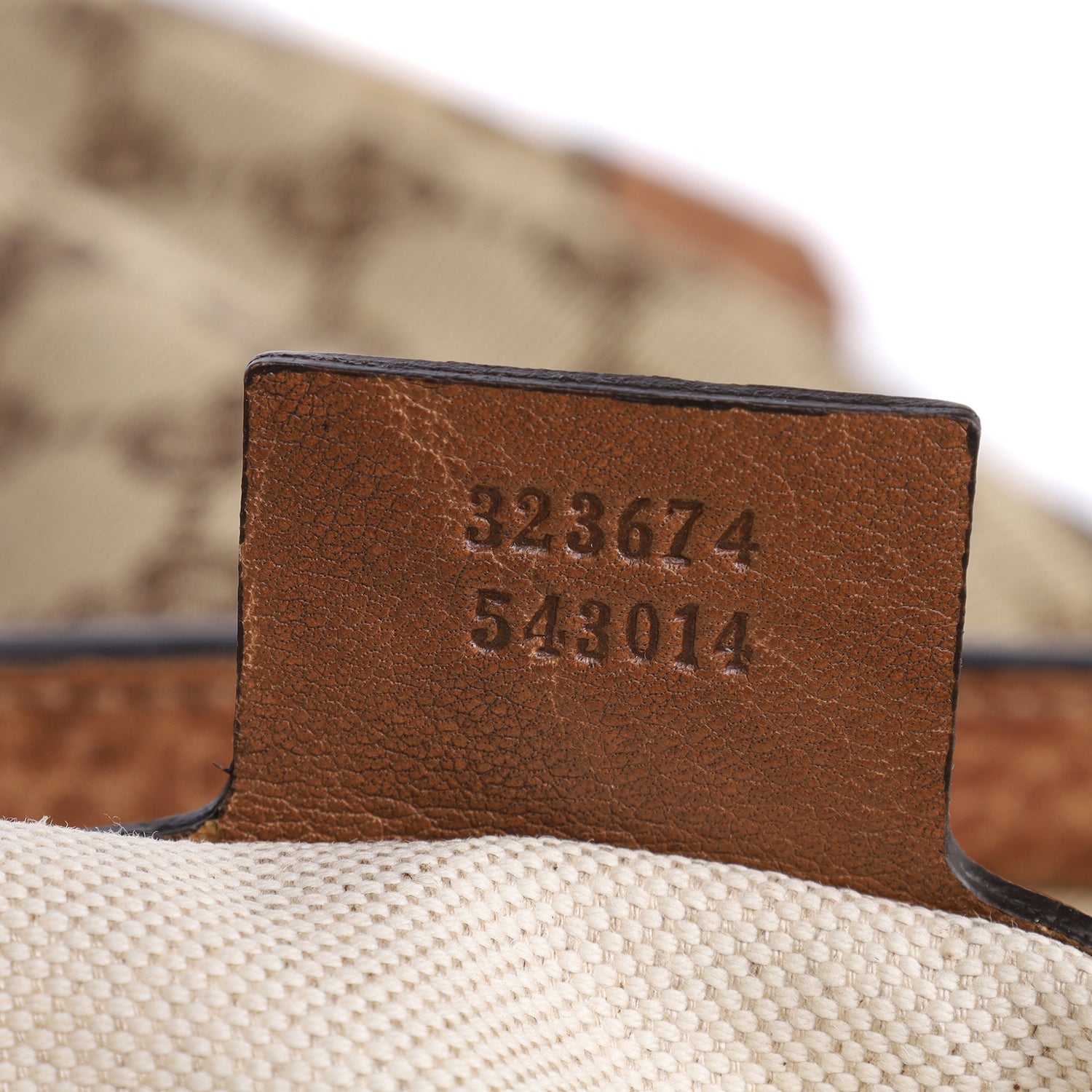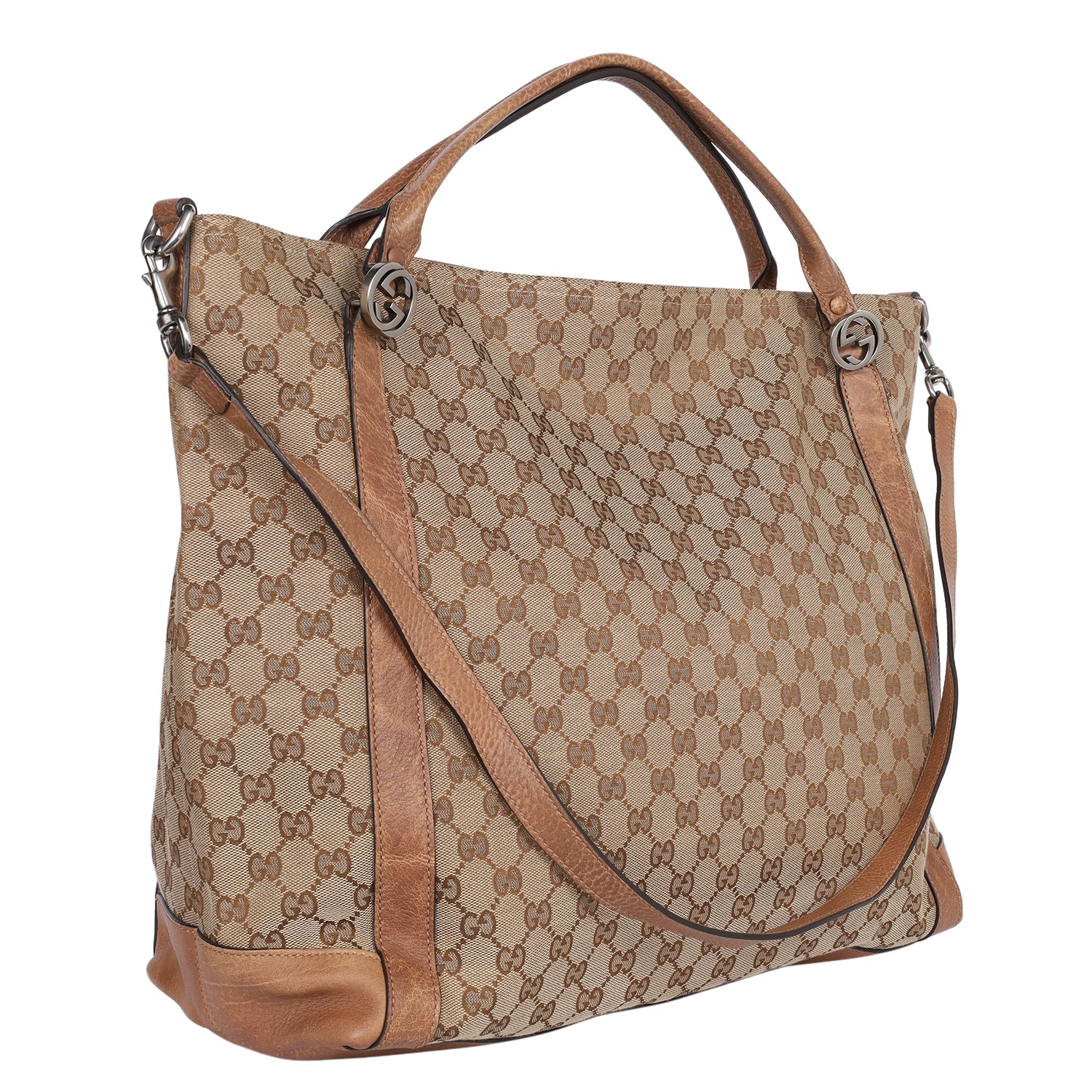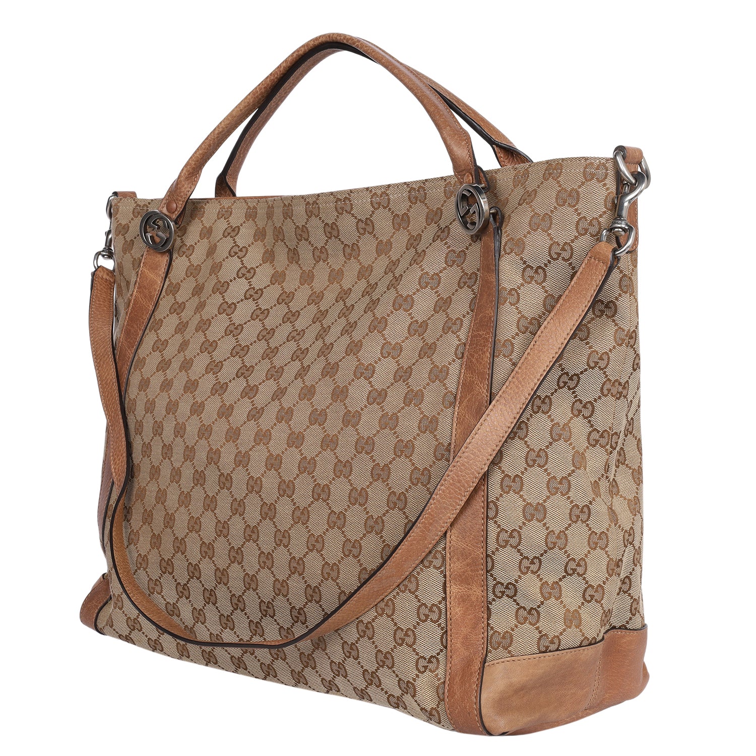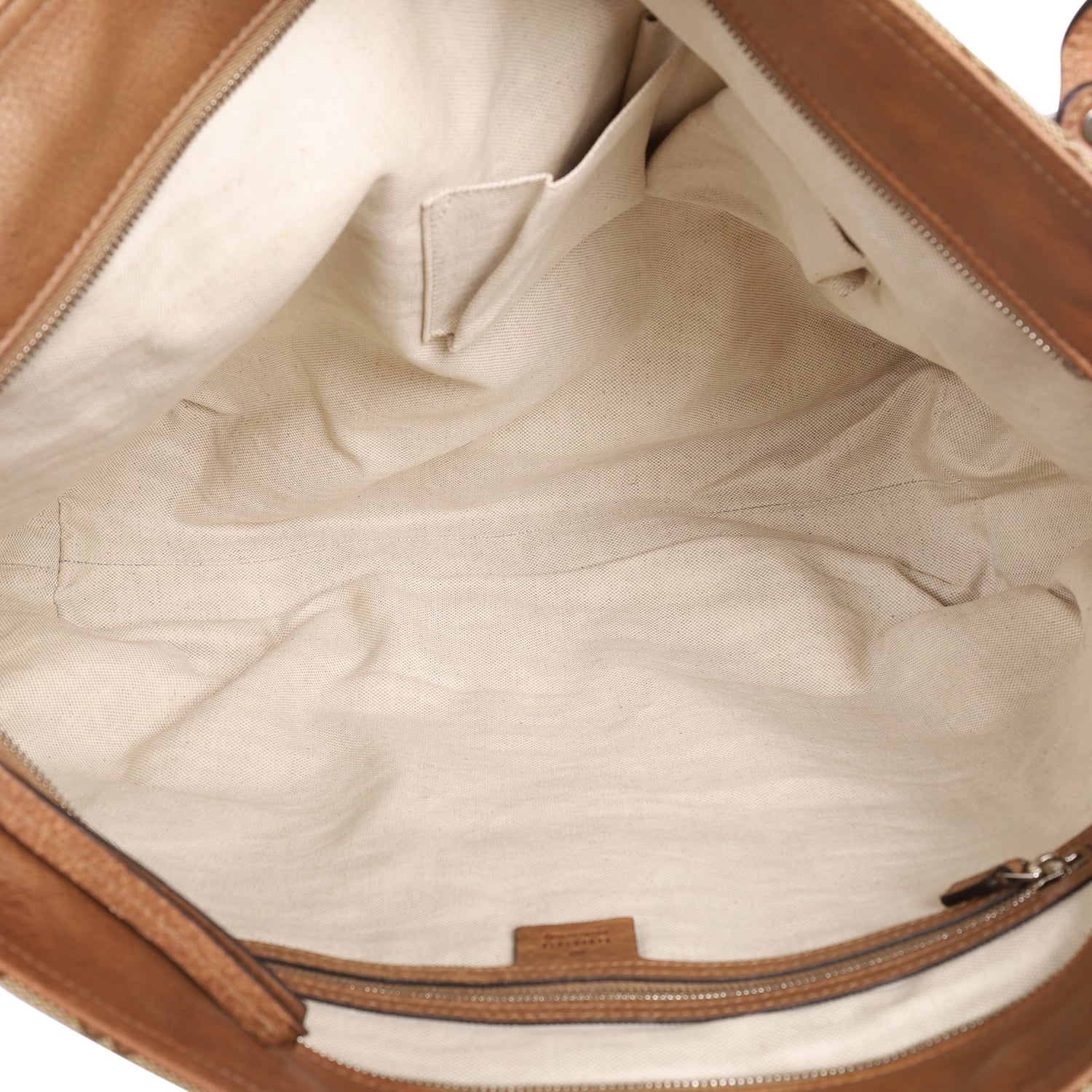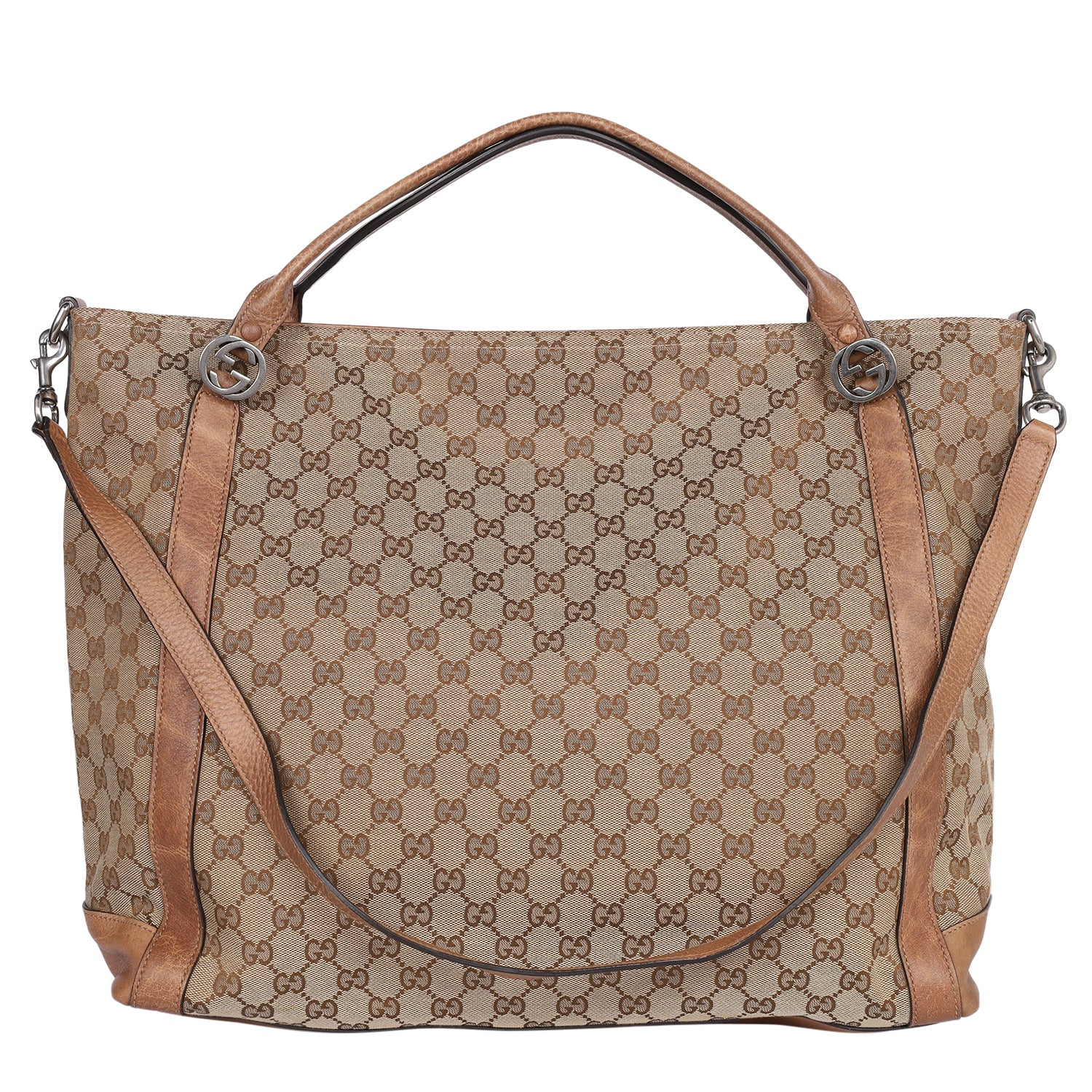 Features monogram GG canvas with destressed leather trim, zipper top closure, shoulder straps, removable strap, fabric interior lining with slip pocket and zipper pocket.