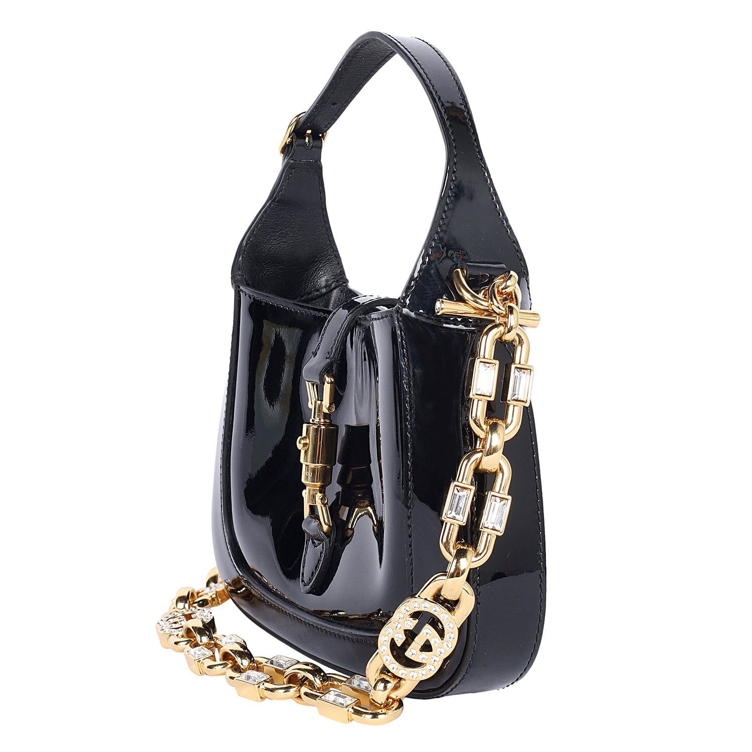 The Gucci Jackie 1961 Small Hobo in black patent leather is a timeless and sophisticated luxury handbag. Crafted from smooth, high-quality patent leather, this designer shoulder bag features a sleek silhouette, a comfortable looping top handle, an optional gold chain shoulder strap with crystals throughout and crystal GG logos. The signature piston closure adds a refined Gucci touch while ensuring secure storage.