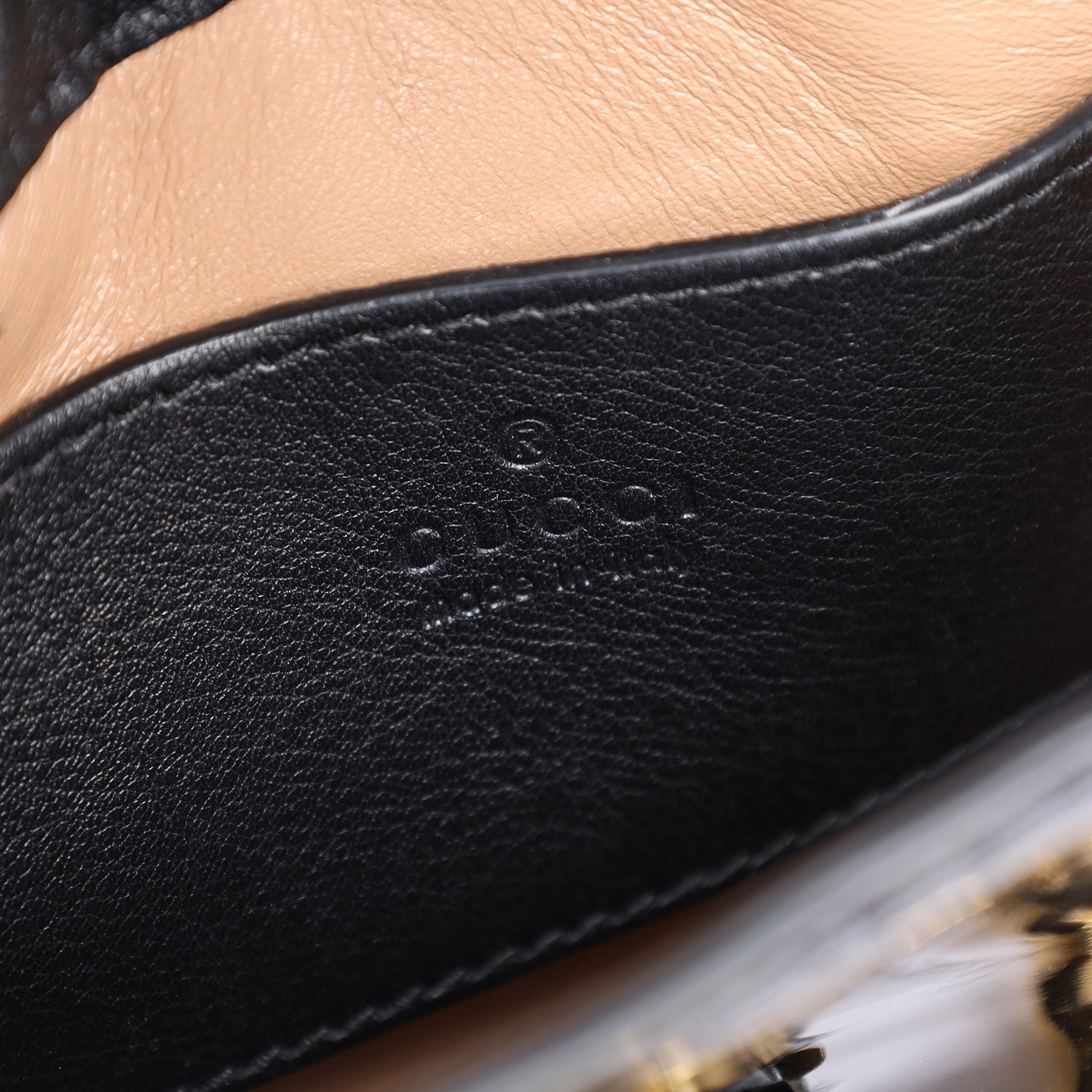 - Interior: Beige leather lining with a slip pocket