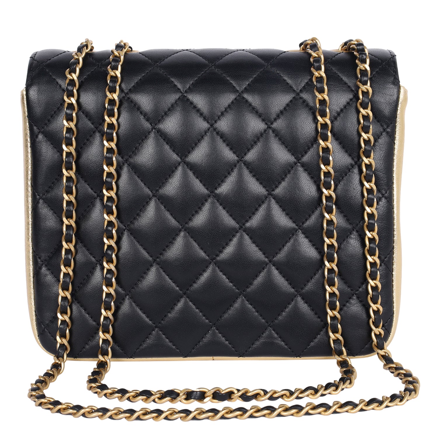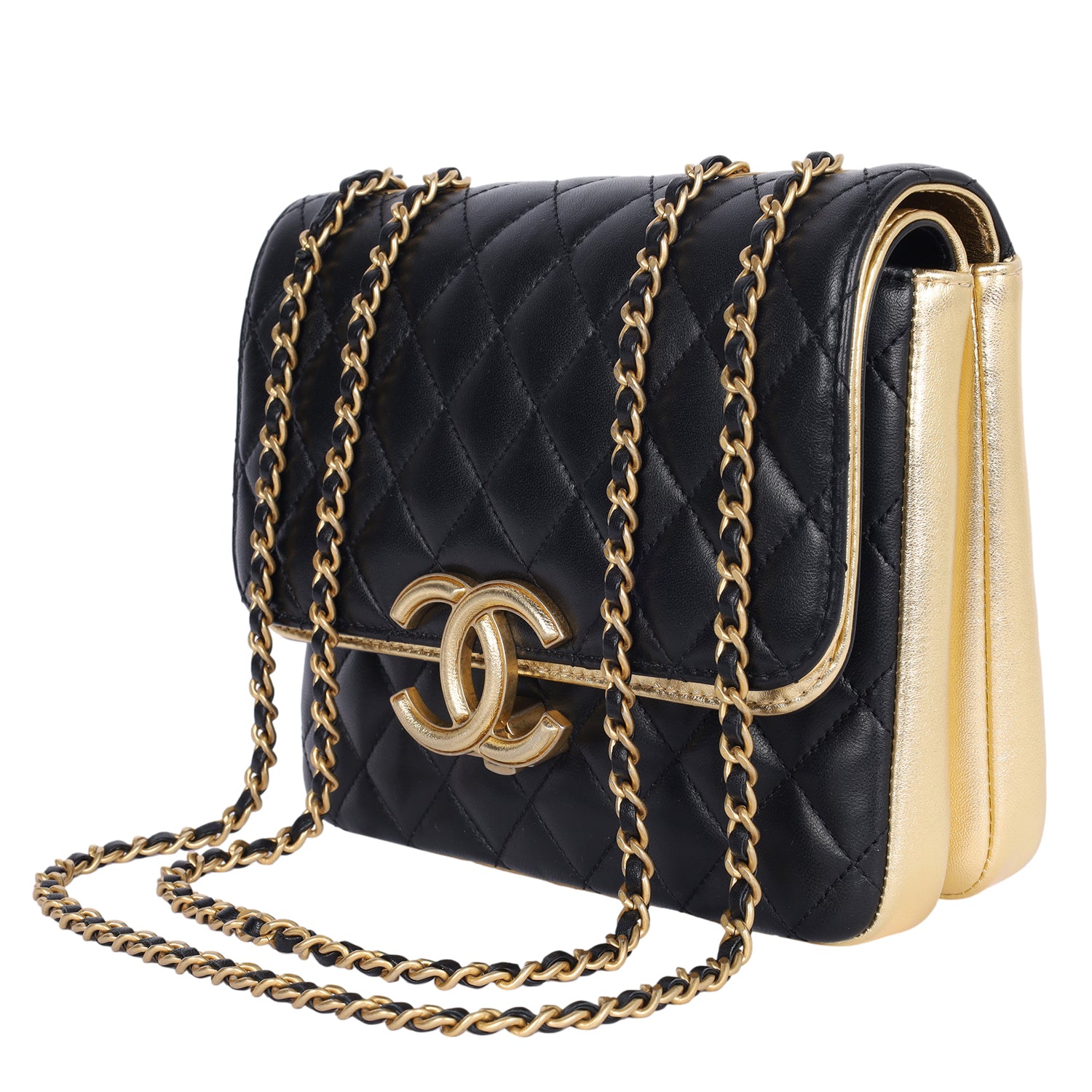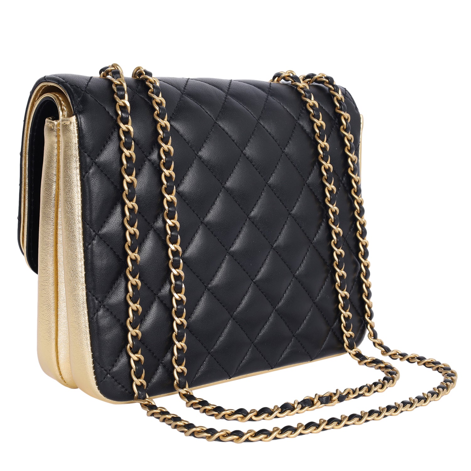 Replica Sunglasses Chanel double flap quilted lambskin leather shoulder cross body bag in black. Features quilted leather with gold accent leather, gold hardware, a long gold chain strap with leather insert, front clasp closure. The interior features gold lambskin leather, double flap with snap closure, featuring large pockets with zipper and slip pocket.