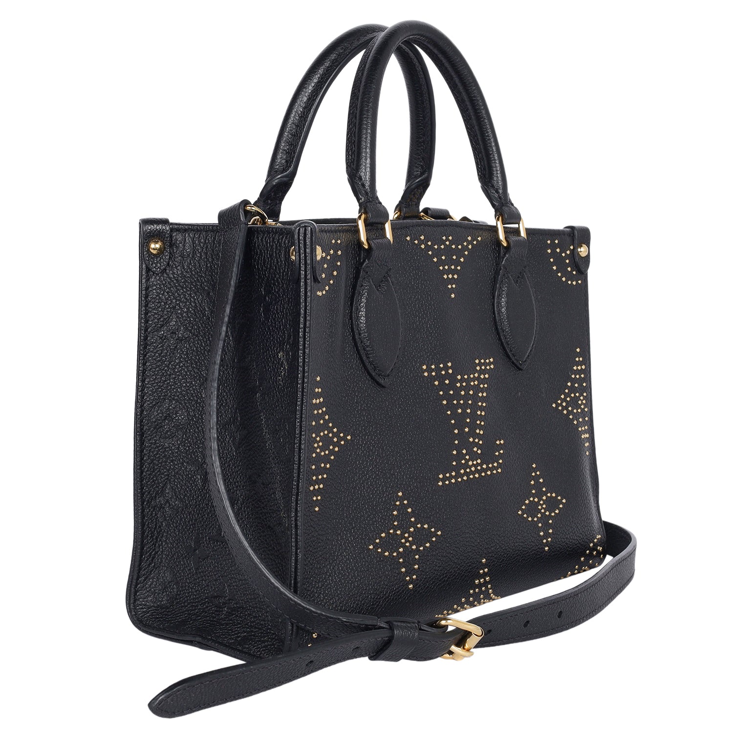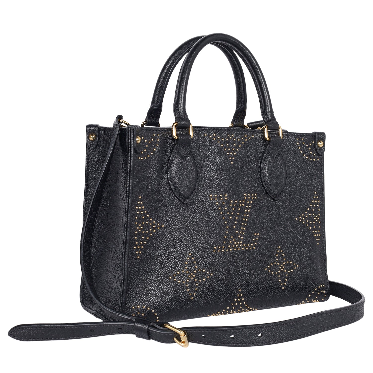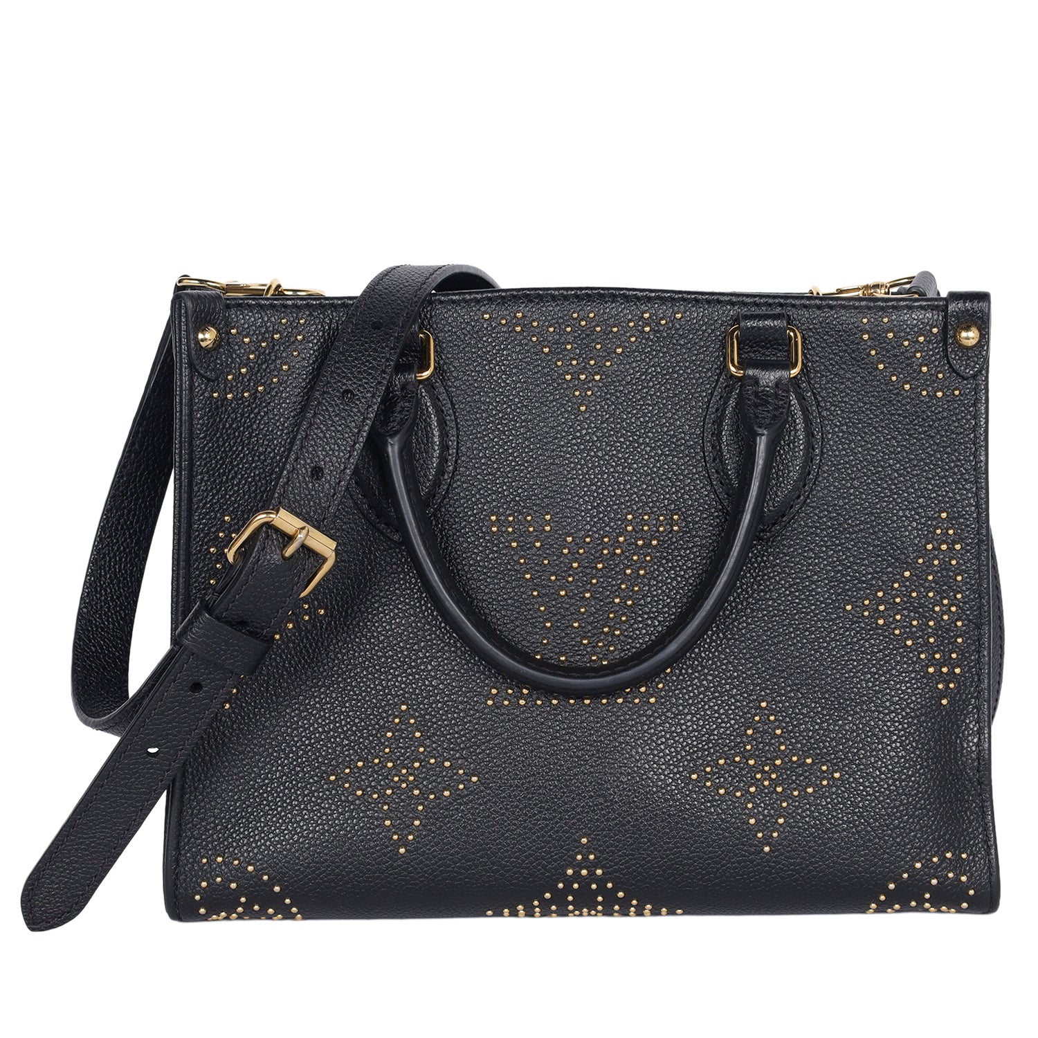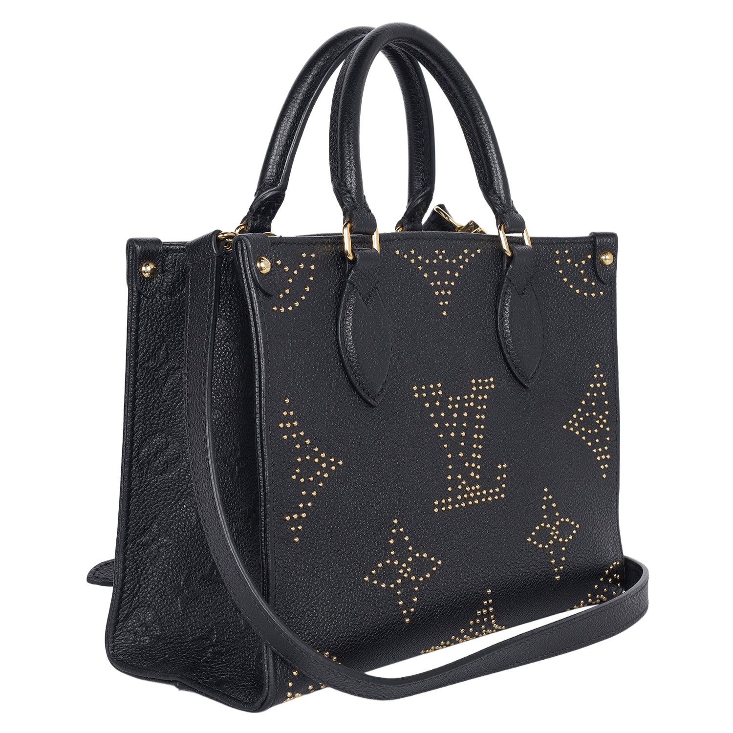 Replica Sunglasses Louis Vuitton Black Studded On The Go Tote with strap. This bag from Louis Vuitton is very similar to the Neverfull PM with a bit more structure and easier to carry. "The name says it all: Onthego takes care of business or shopping, with plenty of room for a busy woman's essentials.
