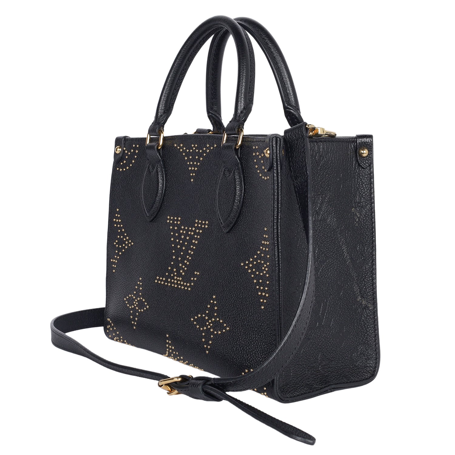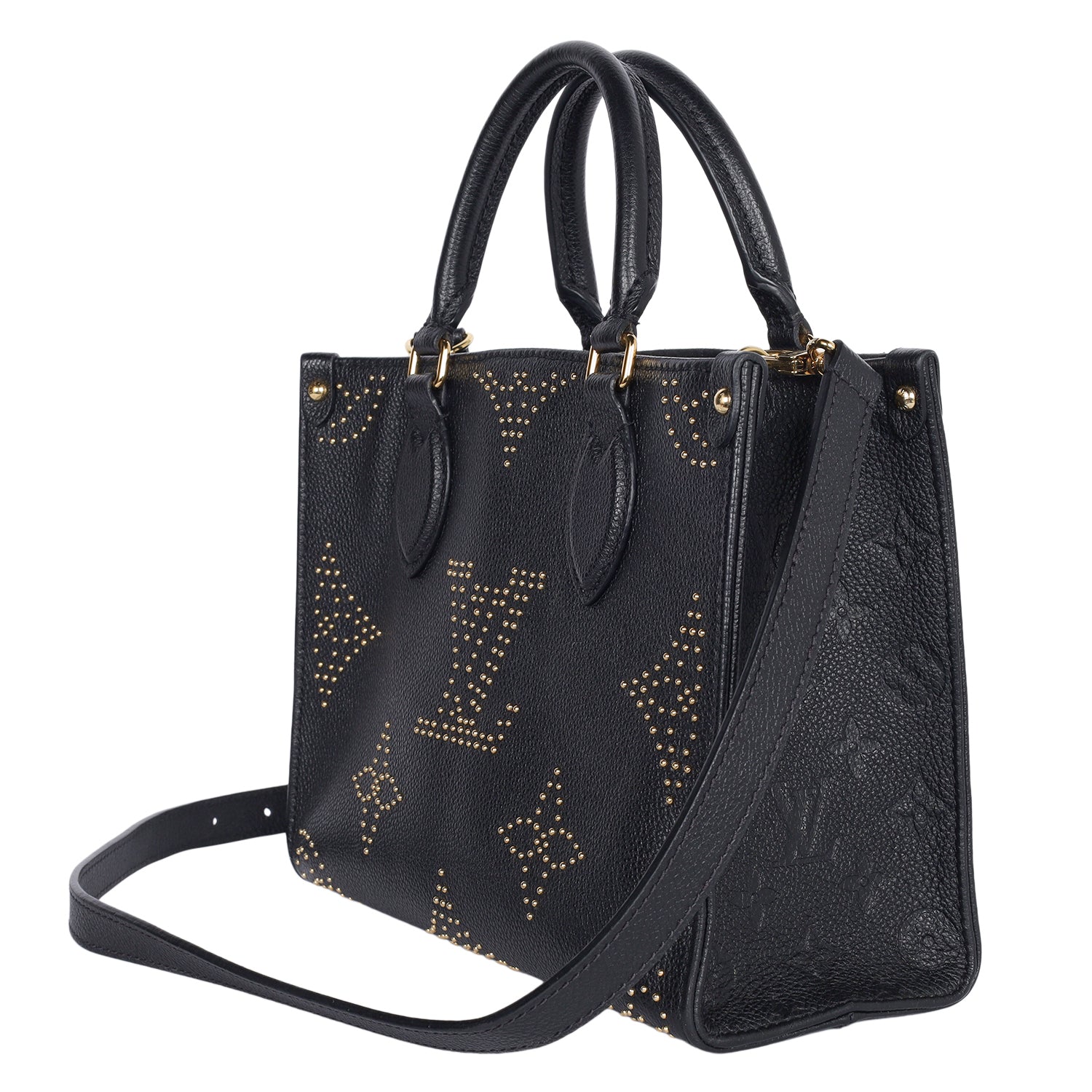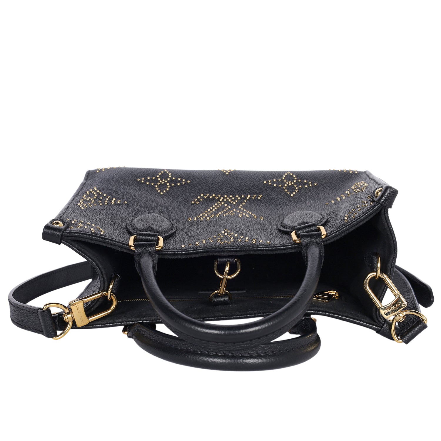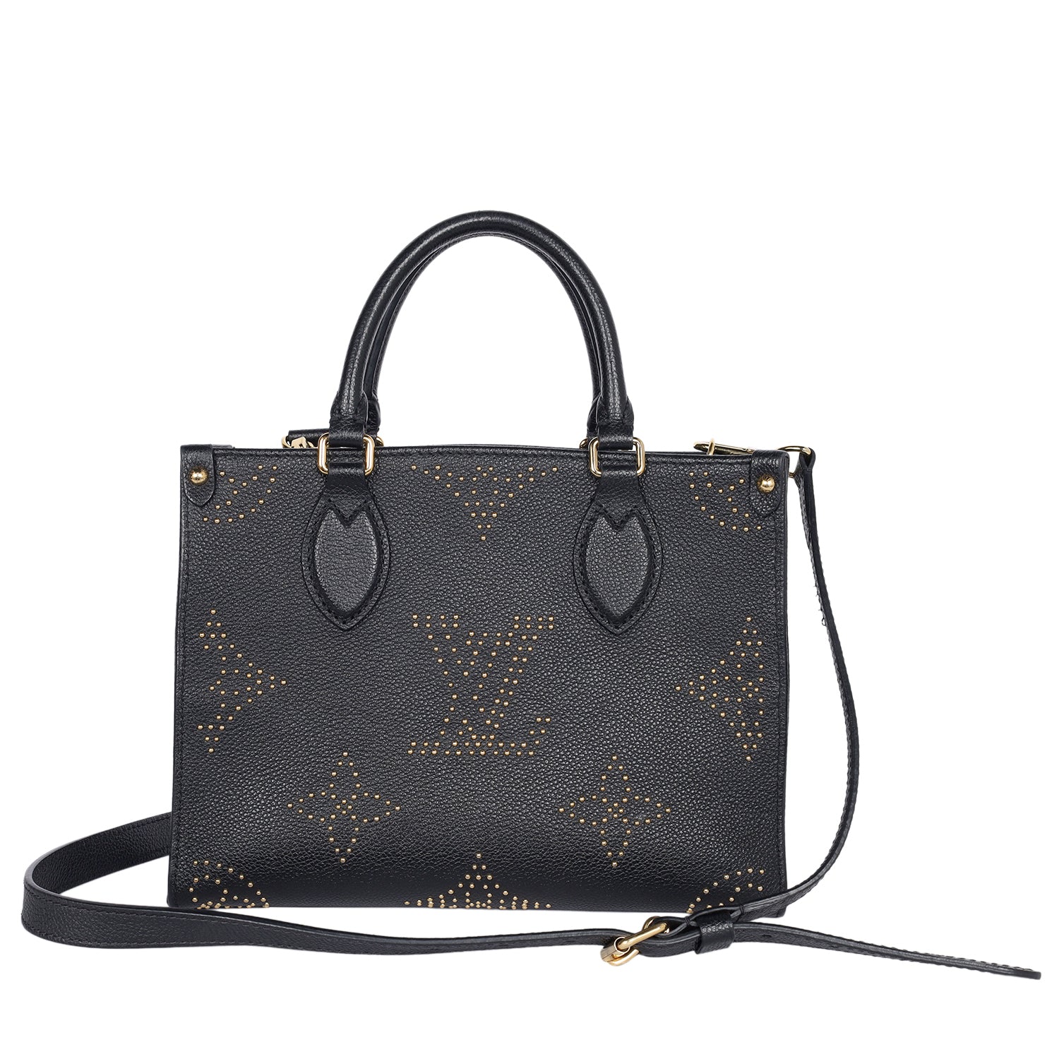 Replica Sunglasses Louis Vuitton Black Studded On The Go Tote with strap. This bag from Louis Vuitton is very similar to the Neverfull PM with a bit more structure and easier to carry. "The name says it all: Onthego takes care of business or shopping, with plenty of room for a busy woman's essentials.