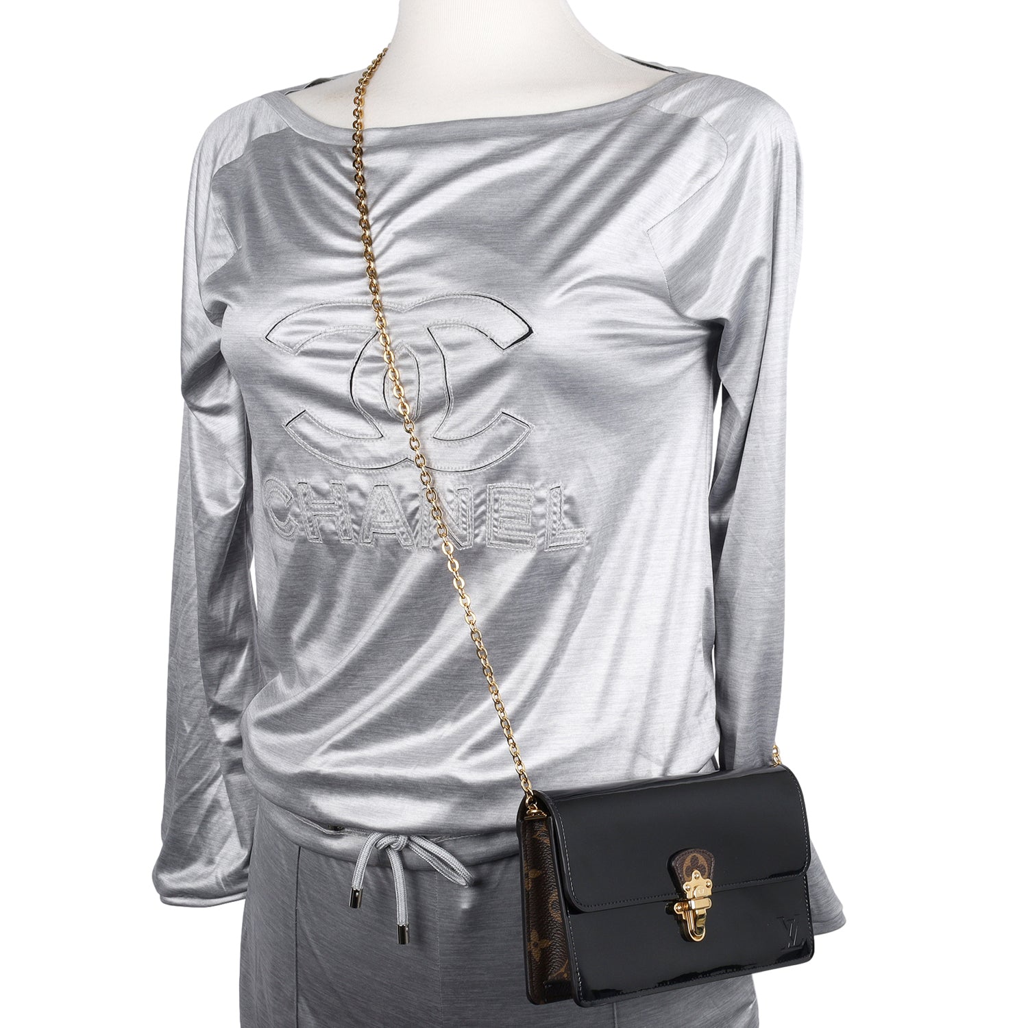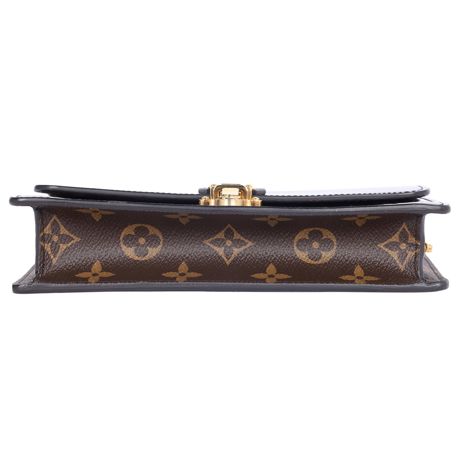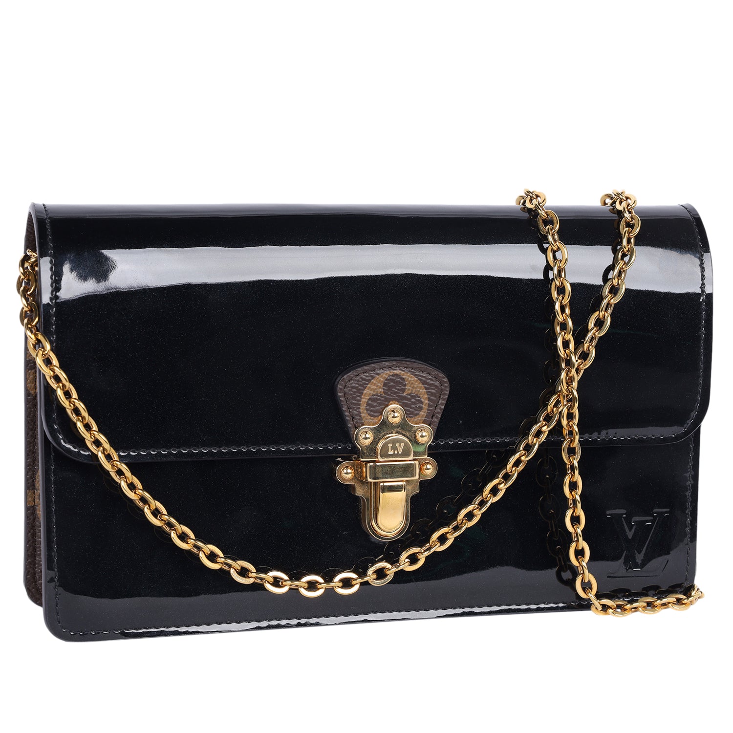 Replica Sunglasses Louis Vuitton Patent Calfskin Mirror Leather Monogram Cherrywood Chain Wallet in Black. This stylish shoulder bag features a mirror glossy patent leather in black with Louis Vuitton monogram coated canvas trim, polished gold chain link strap, front flap with matching polished gold front push lock closure, large interior with a zipper pocket and credit card slots.