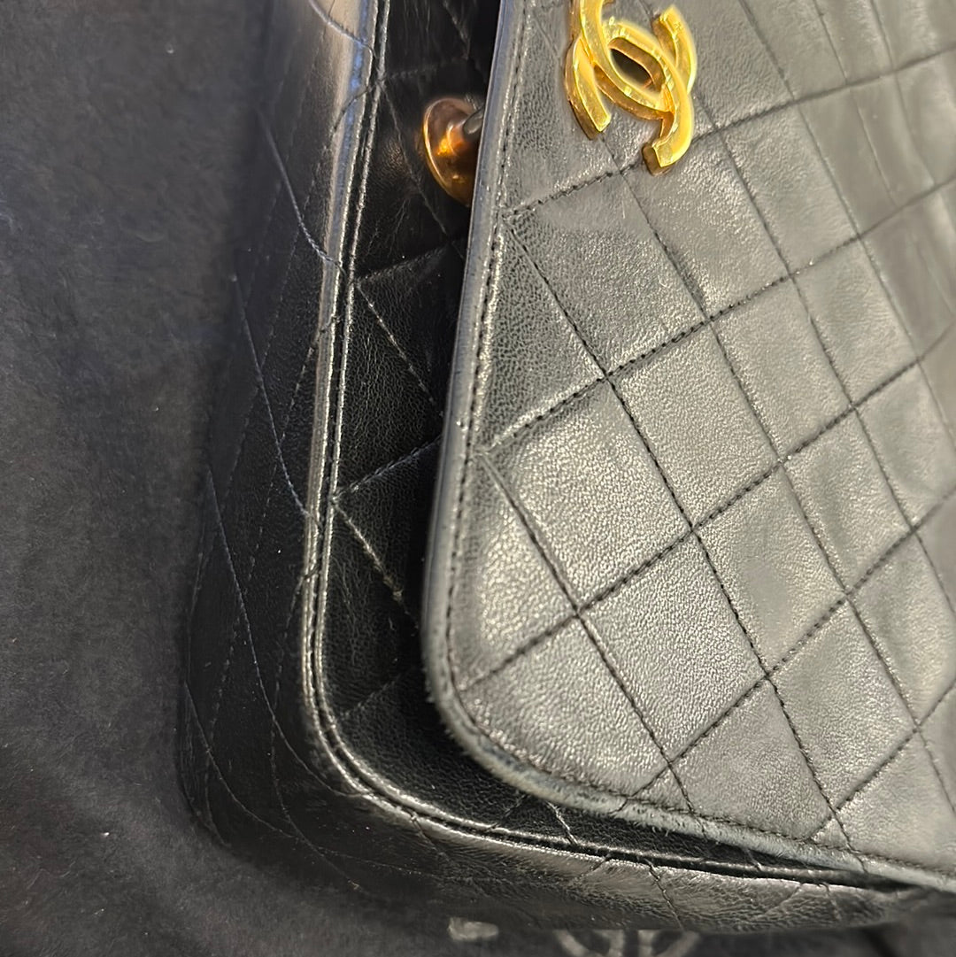 Replica Sunglasses Chanel black classic CC full flap shoulder bag. Black was Coco's happiest color and it's displayed in every Chanel collection. This stylish bag features smooth diamond-quilted lambskin leather in black. The bag features a gold chain leather threaded shoulder strap and a gold turn-lock Chanel CC logo for the front flap closure and rear slip pocket. This opens to a burgundy leather interior with a slip pocket under the flap and a zipper and slip pocket.
