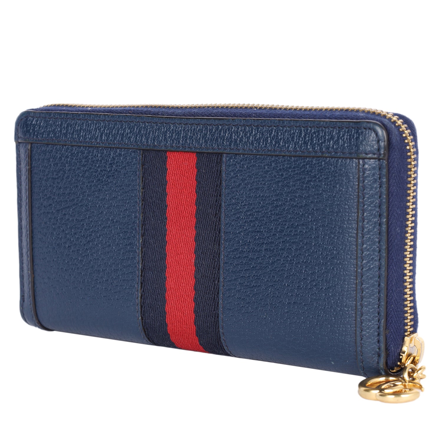 Replica Sunglasses Gucci GG Blue Calfskin Leather Web Ophidia Zip Around Wallet. Features Gucci GG at front, green and red web stripe, blue trim, wrap-around gold zipper in gold and opens to a leather and fabric interior with 12 card slots, storage slots and a middle zipper compartment.