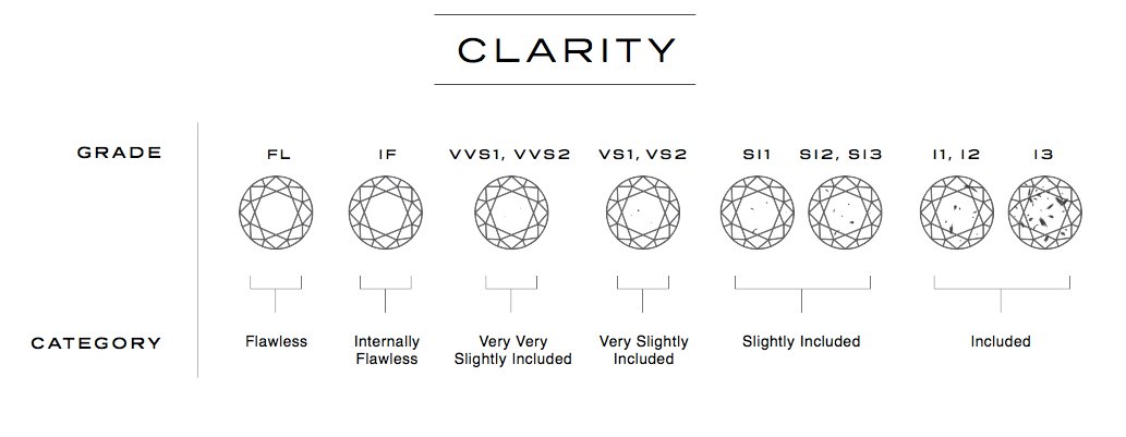 Clarity: Clarity refers to a ranked scale of perfection or how few blemishes and inclusions there are within the diamond. This rating is determined by the number, size and location of the imperfections relative to the size of the diamond and their overall impact on the appearance of the stone. There are 11 potential grades from flawless to included. A flawless stone with no visible blemishes or inclusions under 10x magnification is extremely rare (and therefore incredibly valuable). Meanwhile an included diamond has flaws visible to the naked eye.